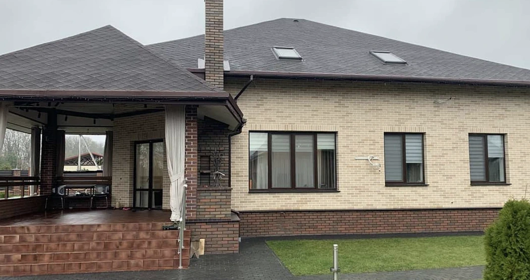 Основная задача этого проекта — получить аккуратный кирпичный фасад без тяжёлой и дорогой кладки декоративного кирпича. Мы загрунтовали основание - газобетонные блоки, подобрали клей сильной фиксации 3140 для фасадных панелей и аккуратно смонтировали листы АМК по разметке, чтобы швы «кирпичей» сходились по высоте и длине. Цвет шва оставили естественным, без добавления чёрного пигмента в клей: так дом выглядит мягче, светлее и ещё больше напоминает южные виллы с тёплым песочным кирпичом. Фасадные панели под кирпич формата «Микс 100» дают живую игру оттенков — светлые и чуть более насыщенные элементы перемешаны, поэтому фасад не выглядит плоским и «нарисованным».