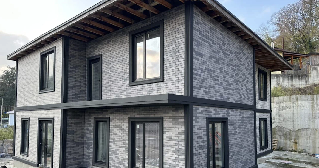 Отдельное внимание мы уделили цвету шва, потому что именно он задаёт характер всей кирпичной «кожи» дома. Для этого использовали белый клей, который на объекте колеровали чёрным пигментом до насыщенного тёмного оттенка и этим же составом аккуратно заполняли швы между элементами. В результате фасадные панели под кирпич заиграли по‑новому: черный шов подчеркнул горизонтали и вертикали кладки, сделал контуры каждого «кирпича» более выразительными и придал фасаду графичный, архитектурный рисунок. Такое решение часто выбирают те, кто рассматривает альтернативу классической декоративной штукатурке и хочет более аккуратную и долговечную отделку фасада.